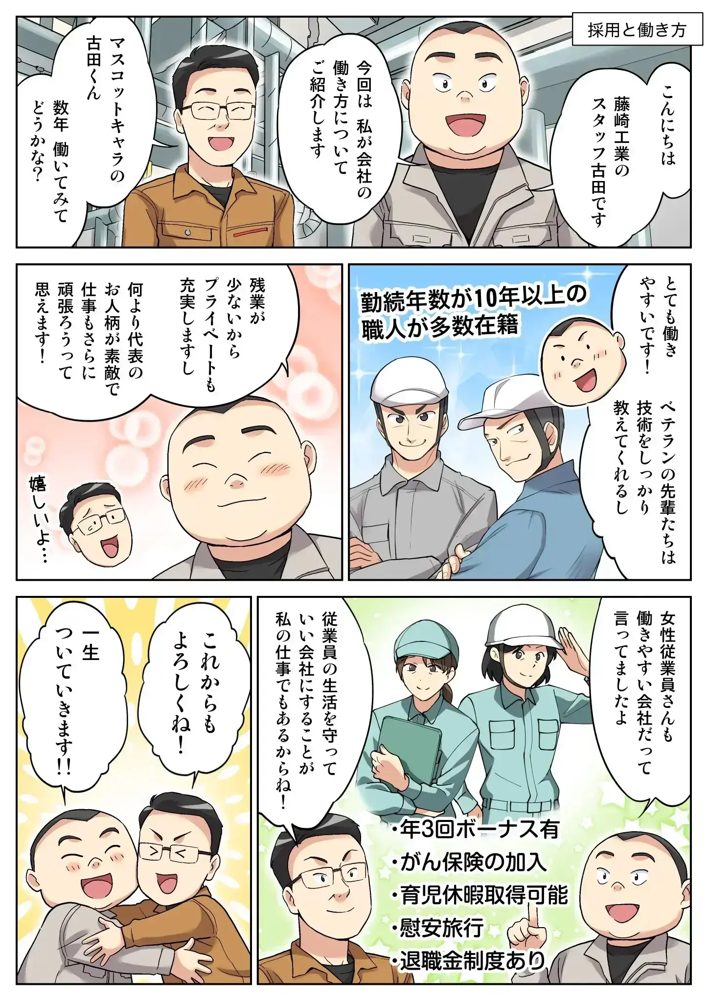 弊社では、勤続年数の長いベテラン従業員が在籍しております。会社を続けられるのは、従業員の力があってこそ。福利厚生にも力を入れ、従業員をしっかりと守っていきます。