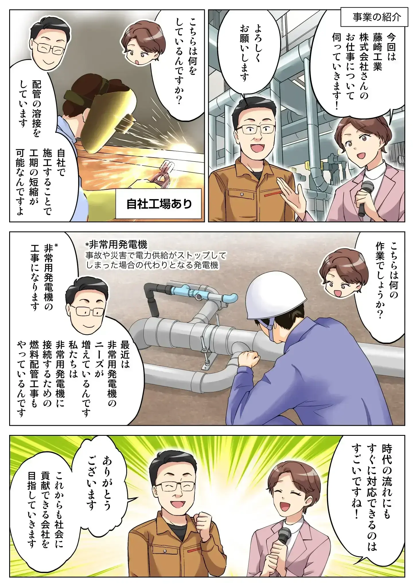 同じことを繰り返すのではなく、常に成長を続けているのが弊社の強み。自社工場での配管製作、対応業者が少ない「非常用発電機」燃料配管工事なども承っております。